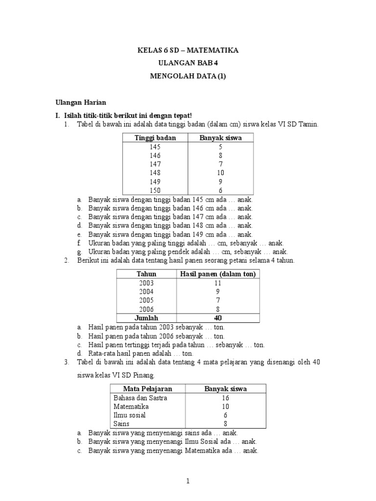 KELAS 6 SD BAB 4 PENGOLAHAN DAN PENYAJIAN DATA. Download Soal Matematika dan Jawabannya versi 1. Kunci jawaban soal ulangan harian matematika kelas 6 sd bab 7 pengolahan data a.